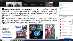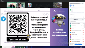 В ходе онлайн-встречи участники познакомились с основными подходами по использованию технологий искусственного интеллекта в педагогической деятельности, с инструктивно-методическими документами, регламентирующими работу по применению цифровых технологий в образовательном процессе, с наиболее актуальными цифровыми решениями и трендами современного образования.